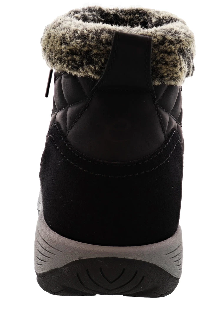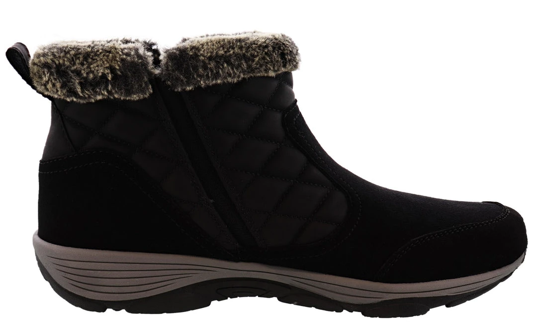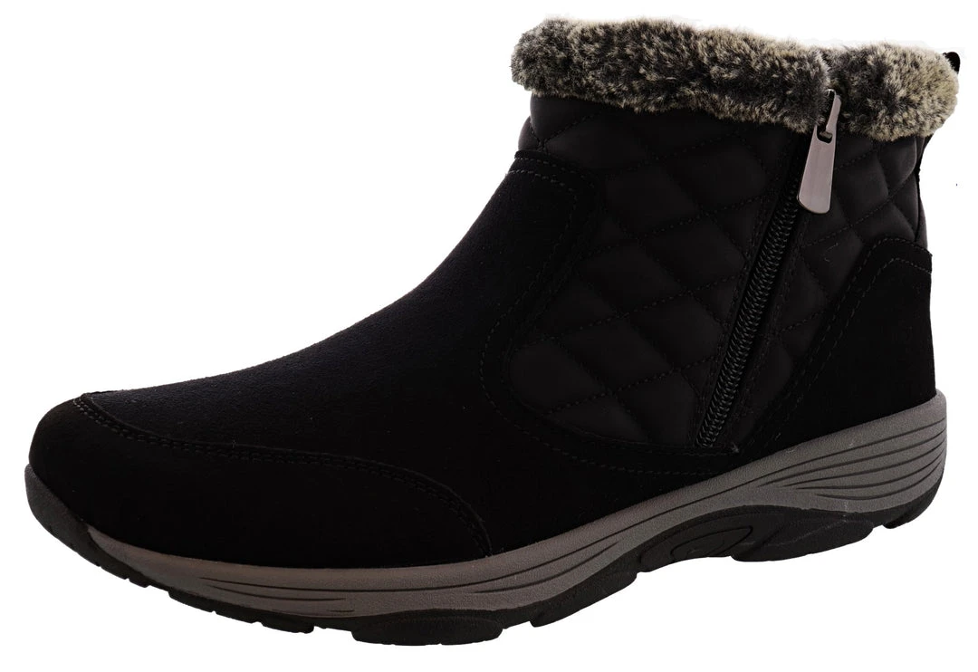 The Womens Easy Spirit Vance11 winter ankle boots are a weather-ready shoe style that allows your feet to stay cozy, and protected from the cold. Its solid construction offers a round-toe front, quilted back, inside zip closure, outside goring for a simpler slip-on, and faux-fur trim. Additional detail includes a microsuede/PU upper with rubber outsole.