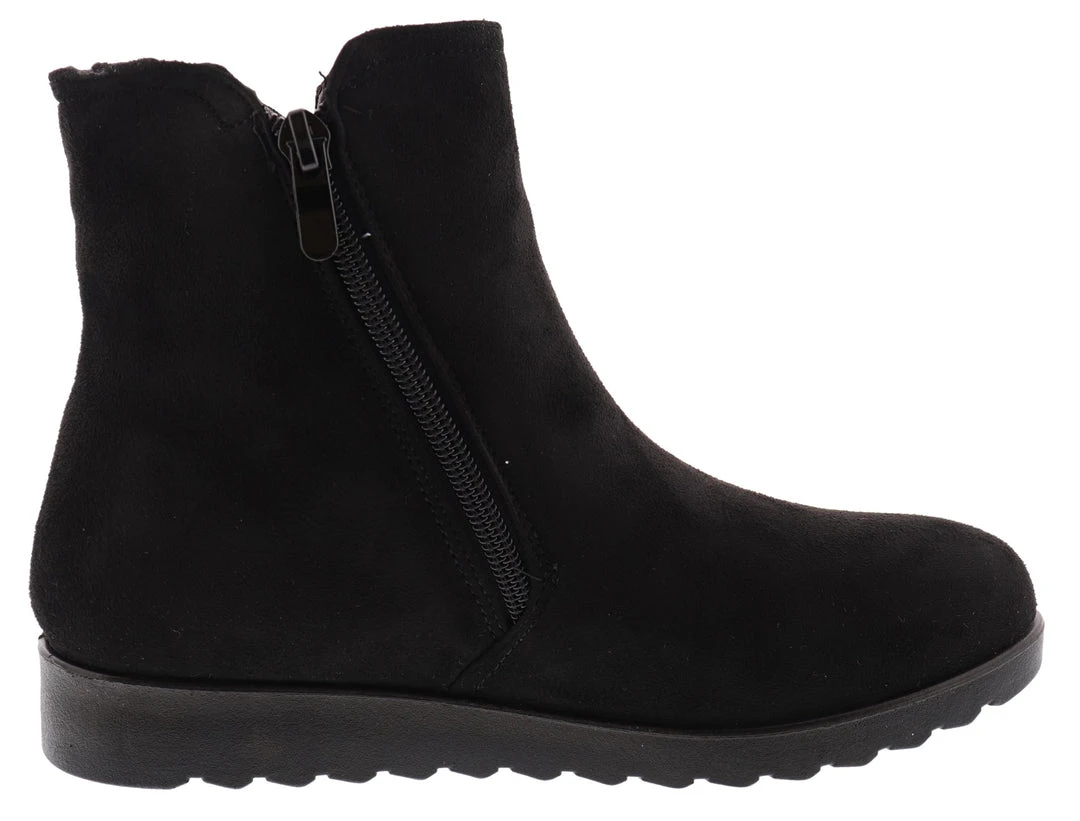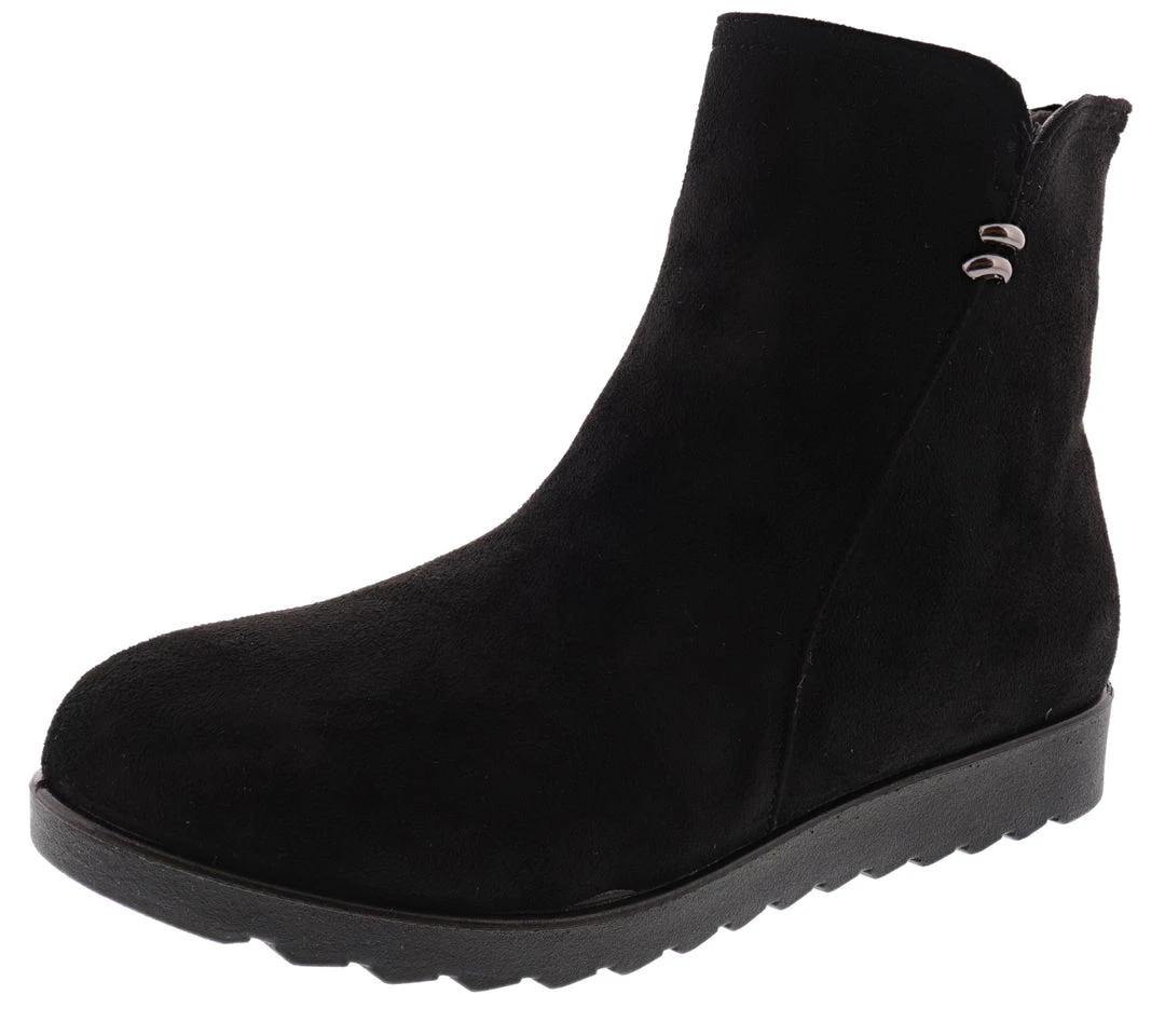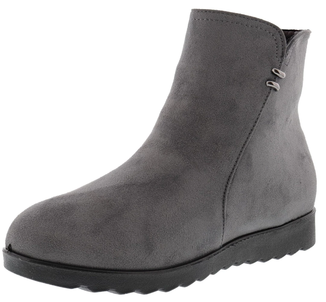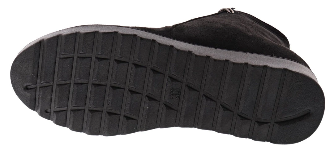 The women’s Flexus Grenzia by Spring Step is a fashionable waterproof microfiber bootie decorated with two gun metal half-ring ornaments and tonal stitching.
