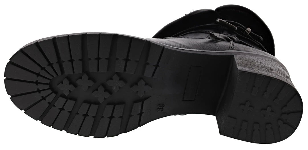 Patricia Steppe Side Zip Closure chunky heeled boots with a fold-down collar beautiful plaid and a crossed ankle strap. Adjustable buckle and studs on a loop knot on a black chunky heeled boots. Closure Buckle Zipper Comfort Flexible Sole Padded Insole Vegan Friendly.
