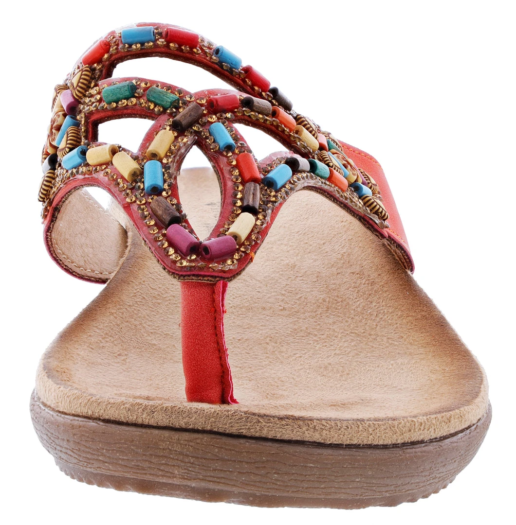 Dainty thong sandal featuring multicolored wooden barrel beads surrounded by rhinestones on a geometric cut out upper with two sides flower design. The soft and cozy foot bed along with the flexible sole assures all day comfort.