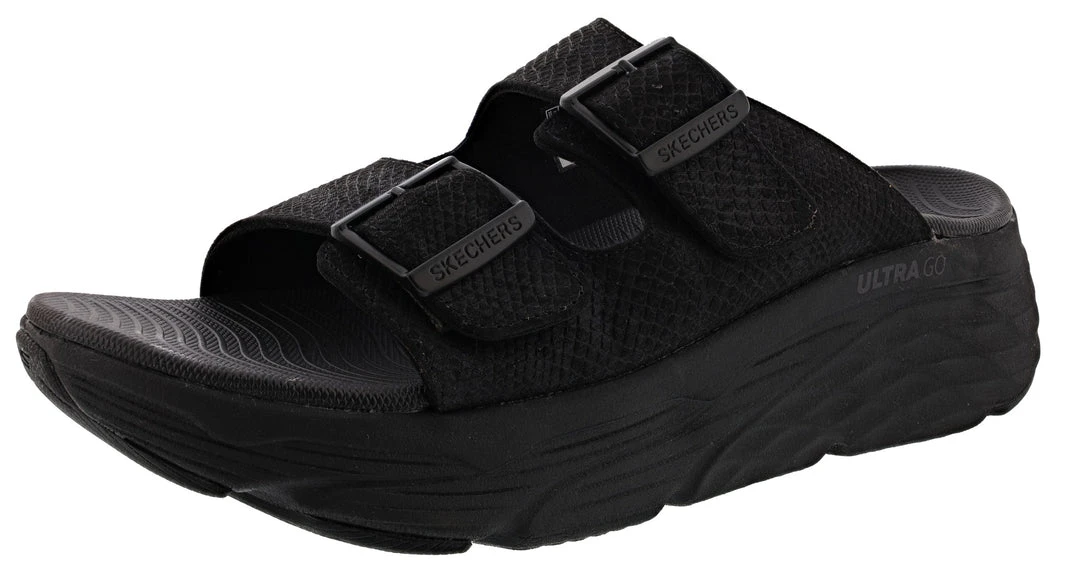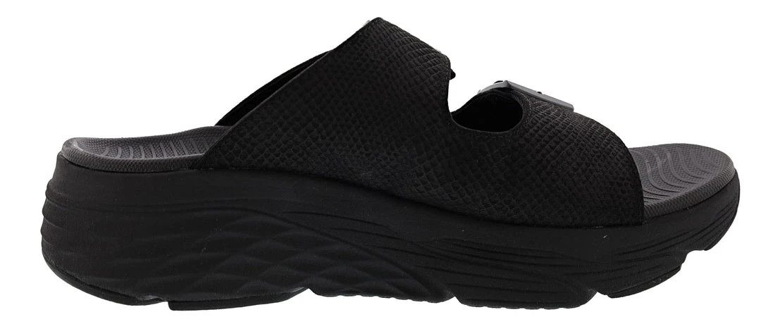 Skechers Max Cushioning Thrive Dual Strap Slip On Sandals. This Skechers Max Cushioning womens sandals are a dual strap slide sandal featuring a cushioned Goga Mat comfort insole. Skechers Goga Mat sandals a cushioned comfort footbed for a smooth heel to toe transition. Order your Skechers Max cushioning sandal.Â